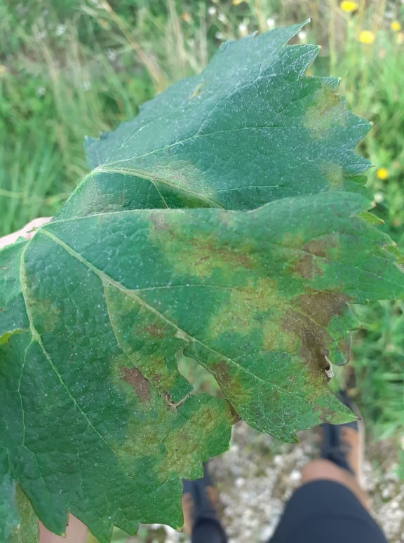 Importé des Etats-Unis à la fin du 19ie, ce champignon est spécifique de la vigne : c'est à dire qu'il ne s'attaque qu'aux vignes. Tous les organes "verts" de la vigne sont sensibles et peuvent être attaqués par le mildiou : feuilles, tiges et grappes. Les symptômes apparaissent assez tôt en saison autour de début juin avec des premières apparitions sur feuilles provoquant des petites "taches d'huile" (décoloration jaunâtres, voir photo 3) sur la face supérieure. Sur la face inférieure, des tissus blanchâtres sont visibles et représentent le champignon (voir photo 4 : il s'agit de la même feuille que la photo 3). Les feuilles impactées finissent par rapidement se dessécher et ne peuvent fournir de l'énergie à la plante via le processus de photosynthèse. Viennent ensuite les symptômes sur raisins dès la fin juin avec un duvet blanchâtre, les grappes impactées dessèchent et finissent par tomber (voir photo 5). Cette maladie provoque tout simplement et malheureusement la perte de récolte.