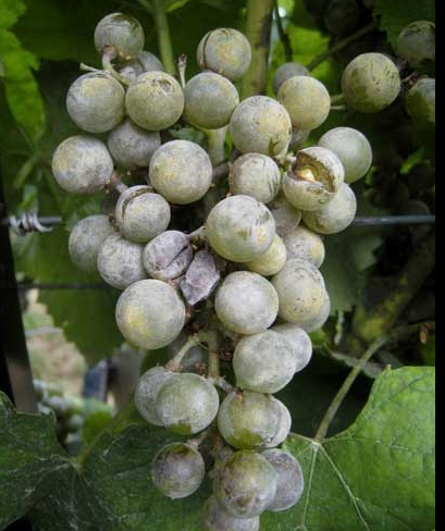 Comme le mildiou ce champignon a été importé des Etats-Unis au 19ie siècle. L'ensemble des organes de la vigne peut être infecté. Les symptômes, plus discrets que ceux du mildiou se caractérisent par un feutrage blanc, poussiéreux sur feuilles et rameaux (voir photo 6). Ils sont le plus visibles sur jeunes grappes, facilement reconnaissables à ce typique "feutrage blanc" et conduisent à l'éclatement des baies lors de la croissance des grappes (voir photo 7). Cette maladie entraine la perte de récolte et pour les grappes infectées encore présentent aux moments des vendanges des odeurs de moisissure persistantes et désagréables.