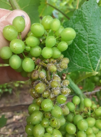 Ce champignon se retrouve sur différents fruits ou plantes-hôtes. Le développement de la pourriture se manifeste généralement en fin d'été à l'approche des vendanges lorsque les raisins sont les plus sensibles (voir photo 1). Lors des années pluvieuses les symptômes peuvent apparaitre bien plus tôt en saison, dès le début juillet comme c'est le cas cette année. (voir photo 2). La lutte contre cette maladie est principalement prophylactique : c'est à dire que des techniques culturales adaptées sont mises en place pour limiter le développement du champignon, exemple : effeuillage, ébourgeonnage, limiter l'entassement des raisins pour aérer la zone fructifère...