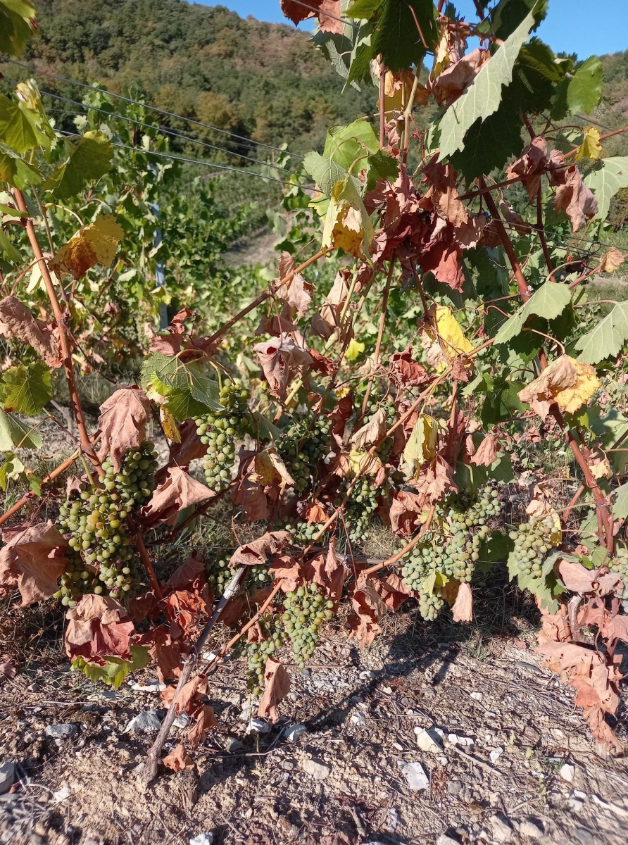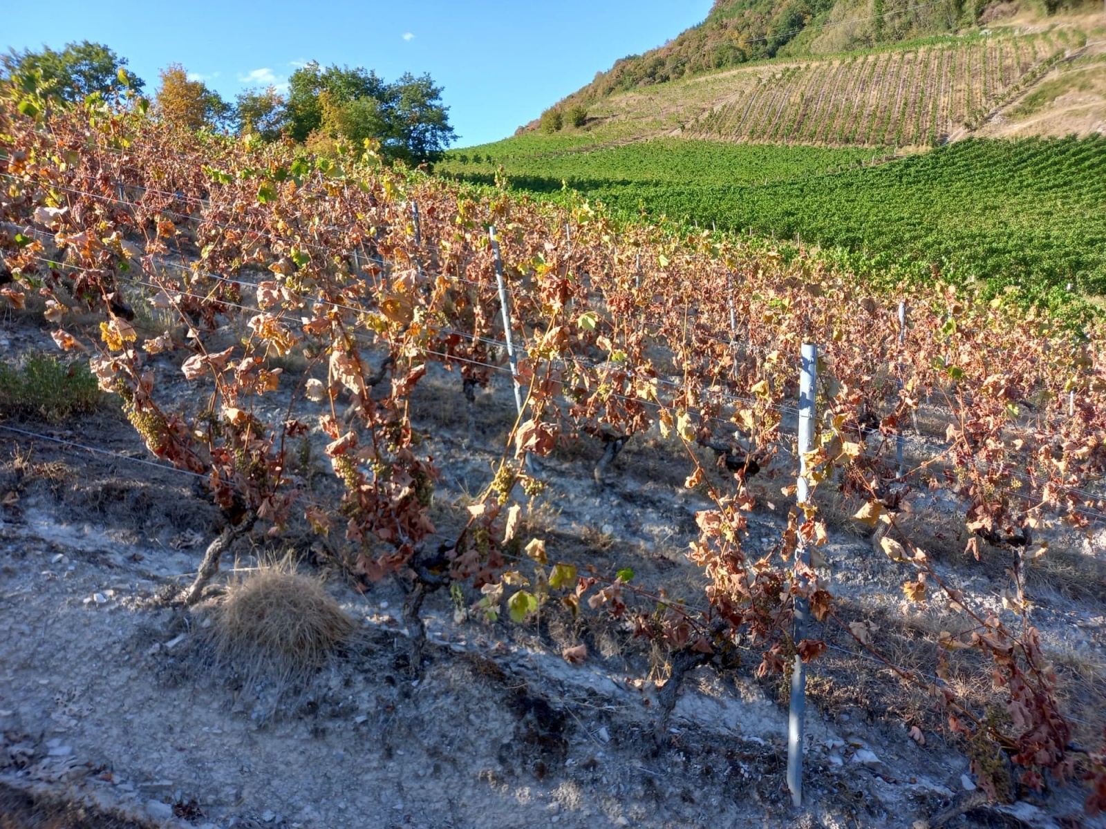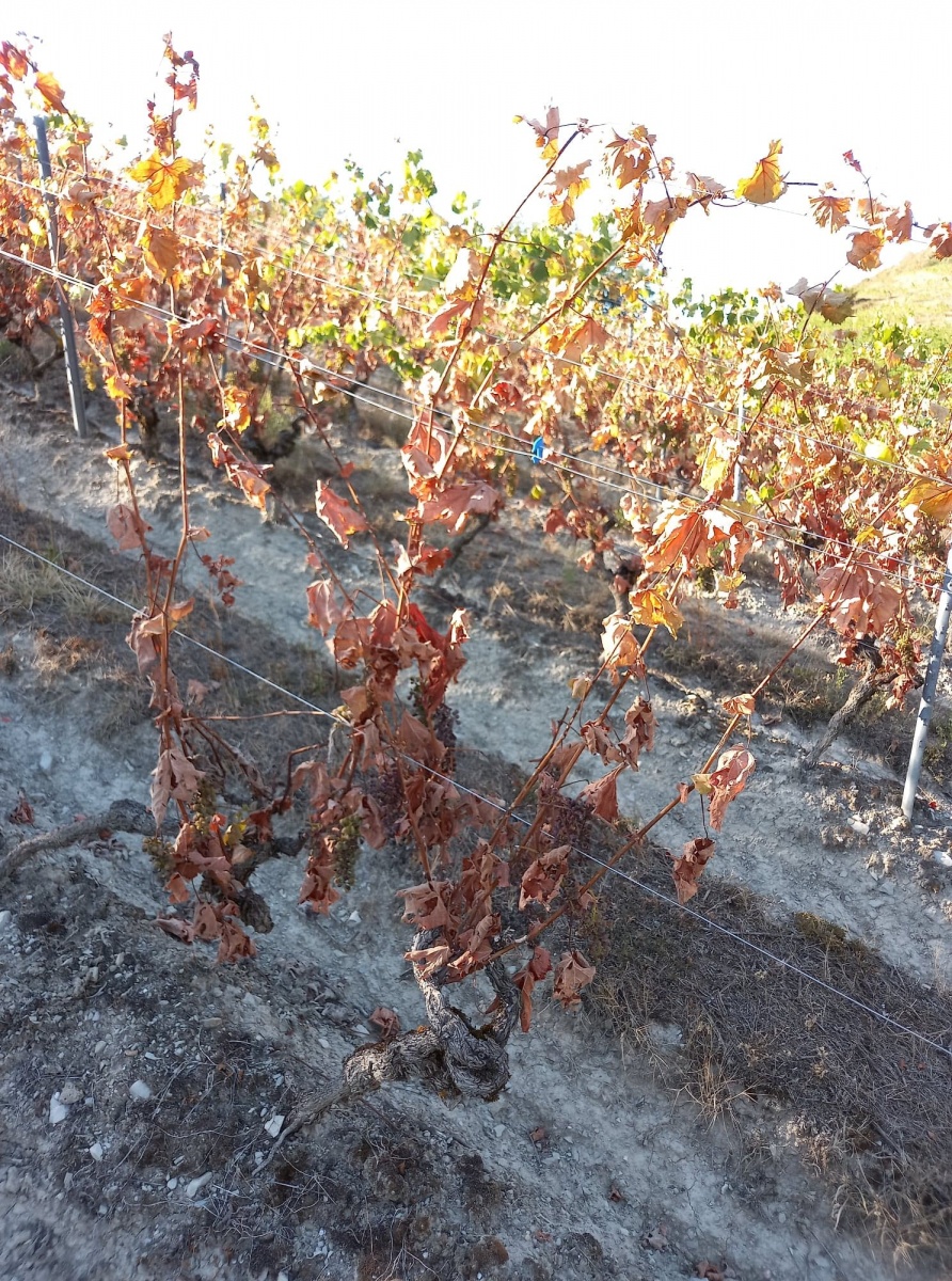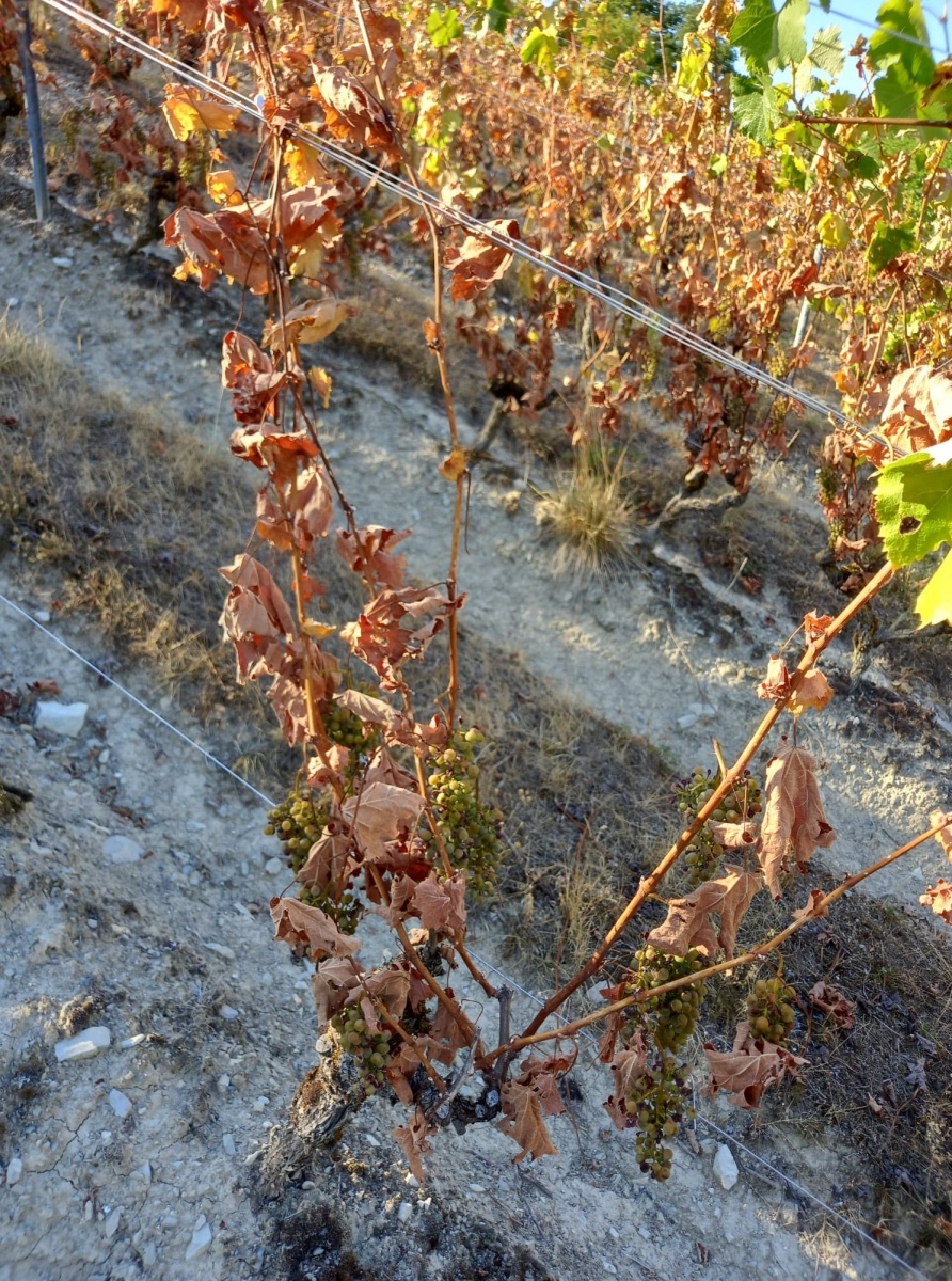 Le cépage altesse est le plus sensible à la sécheresse. Rapidement au cours de cet été caniculaire les vignes d’altesse ont fait apparaitre des signes de souffrance plus ou moins marqués. Sur la commune de Lucey ; la partie septentrionale du Cru Jongieux, nous possédons 2 hectares d’altesse plantés en appellation Roussette de Savoie. Cette partie du vignoble plantée sur des marnes calcaires possède peu de terre. Le manque d’eau se fait plus sentir sur ces vignes-là plus que n’importe où ailleurs. Au 25 juillet des dizaines de ceps étaient déjà complétement défeuillées avec une perte nette de la récolte. Heureusement ces ceps ne meurent pas. Ils se mettent en blocage total et repartent au printemps prochain mais créent un véritable choc visuel dans le vignoble. (voir photo)