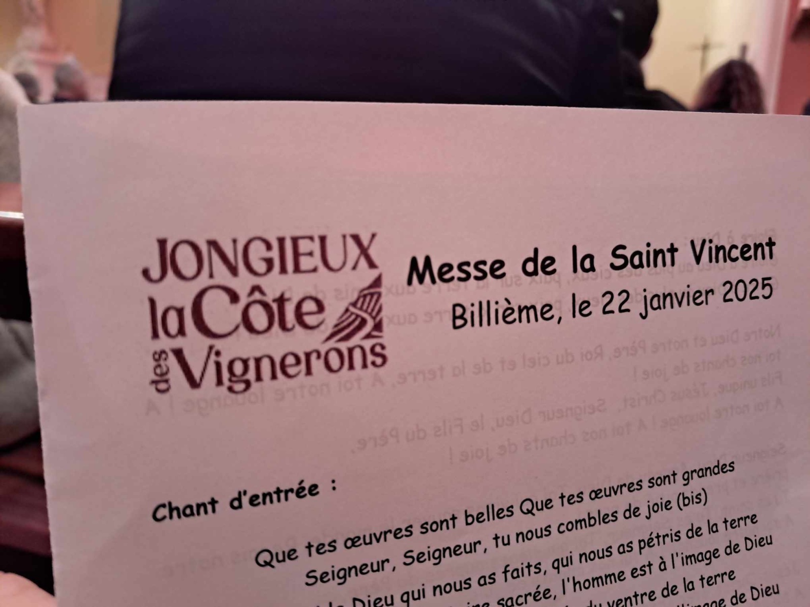 La journée commence tout d'abord par l'action la plus solennel, la plus sérieuse (et peut-être symbolique) : la messe en l'honneur de Saint Vincent. La prière à Saint Vincent (voir en fin d'article) fait partie de l'office et nous rappelle le lien spirituel entre le vin et la religion, plus simplement : le sens du vin dans nos vies, nos coutumes et nos territoires. Le pain et bien évidemment le Vin sont bénis avant d'être partagé lors du premier apéritif de la journée. Commence ensuite le repas ou plutôt le banquet que nous partageons sur de grandes tables où se retrouvent tous mélangés amis, vignerons, salariés et même le curé !